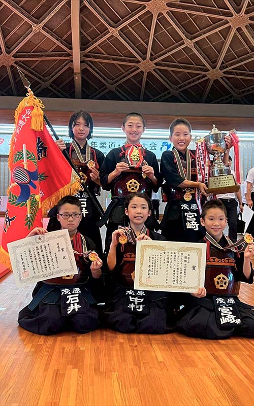 7月24日、千葉県武道館で開催された第38回千葉県警察タッチヤング少年柔道・剣道大会に茂原警察署チームとして参加しました。大会は先鋒、次鋒が4年生以下で、中堅から大将が5年生以上という試合形式で行われました。千葉県警が主催ということもあり、審判員の方々も全員が千葉県警剣道特別訓練員の方々でした。試合は初戦から接戦続きでハラハラドキドキの連続。そんな中、最終の決勝リーグへ進出。決勝は3チームによるリーグ戦でおこなわれ、1勝同士で迎えた前回優勝の千葉西警察署(上の台剣友会)との対戦です。次鋒を先取されましたが、すぐ副将が取り返して優勝をかけた大将戦です。そして、大将戦でみごとに勝利し、優勝することができました。この結果をひとつの自信としてこれからも選手たちには頑張ってもらいたいと思います。とにかく、よく頑張りました。