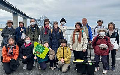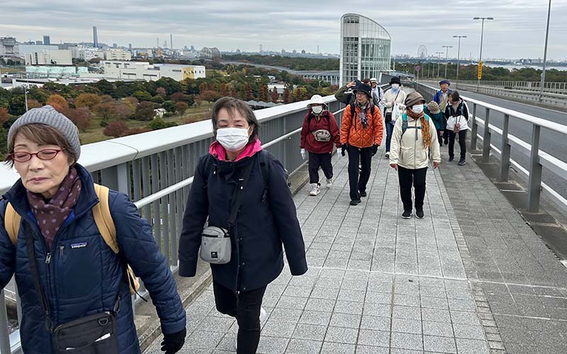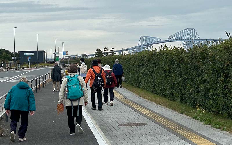 朝8時に一宮町保健センター前から町民バス一宮号に50代から80代までの総勢16名が乗り込み、圏央道からアクアラインを通り、東京湾を望む若洲海浜公園に到着。潮風が薫る堤防に聳える昇降タワーから橋上に上がり、船舶の行き交う東京湾の最奥部、都心のビル群を眺望しながら、大きな橋を歩きました。この日の天気は曇り空、風も少なく、絶好のウォーキング日和で、ゲートブリッジから降りた後、水分補給しながら、水上スポーツで賑わう水上競技場を眺めながら海の森大橋を渡り、湾の埋め立てによって出来た海の森公園までを歩き通しました。